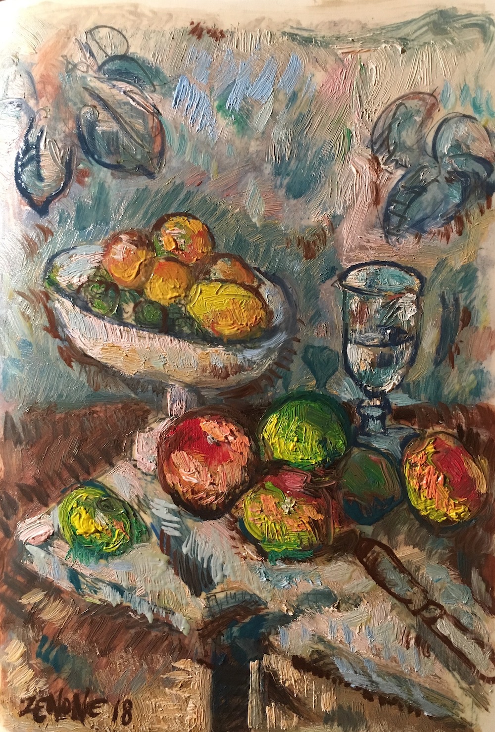 Domenica scorsa ho dipinto questa natura morta ispirandomi a un quadro di Cézanne, il grande. L'uso dei colori, delle pennellate, degli accostamenti di colore sono alcune delle cose che ho imparato facendo questo olio su carta sul mio quaderno Moleskine. Mi ha dato soddisfazione.